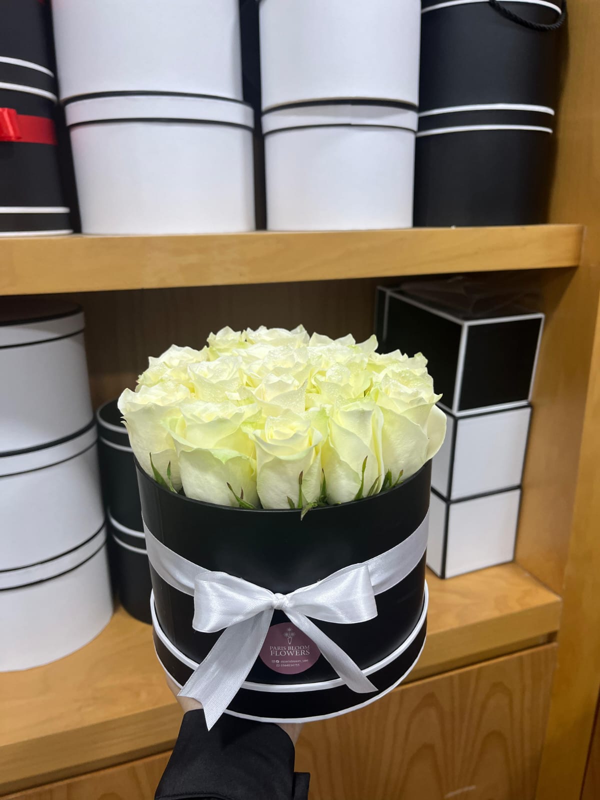 16 pristine white roses beautifully arranged in a luxury gift box —