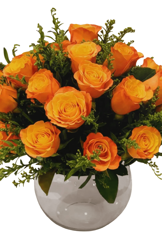 A radiant bouquet of 35 vibrant orange roses, complemented